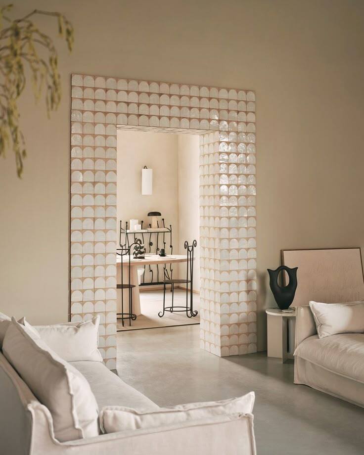 Pay attention to the scale of your space to determine the border thickness. If you’re working with low ceilings and your doors are close together, you might want to select something that is more of a slim trim detail, or just actually tile the internal walkthrough section of the wall (rather than the face of the wall). It will still give a glimpse of interest from the right angle.