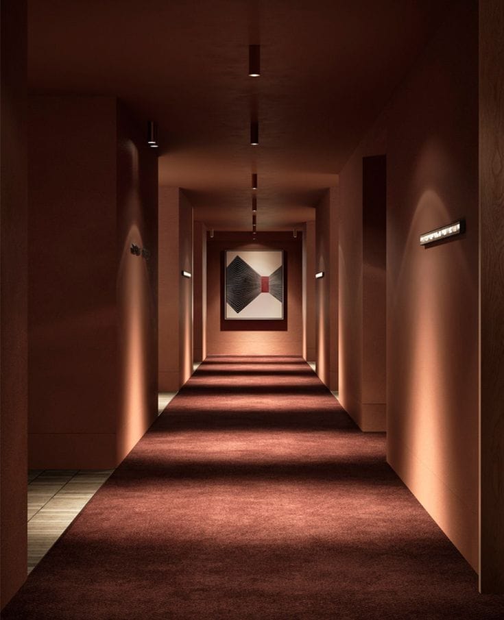 In the Hyatt hallway, we have a beautiful example of how lighting is the finishing touch when it comes to a dramatic hallway. I love the ‘spotlight’ feel in dark-drenched spaces, where it casts interesting shapes and shadows which makes walking through the space feel like more of an experience. We also have lighting in unexpected positions - more spotlights washing the left hand side wall so that we can peep the switches. Practical and aesthetically interesting. Tick, tick.